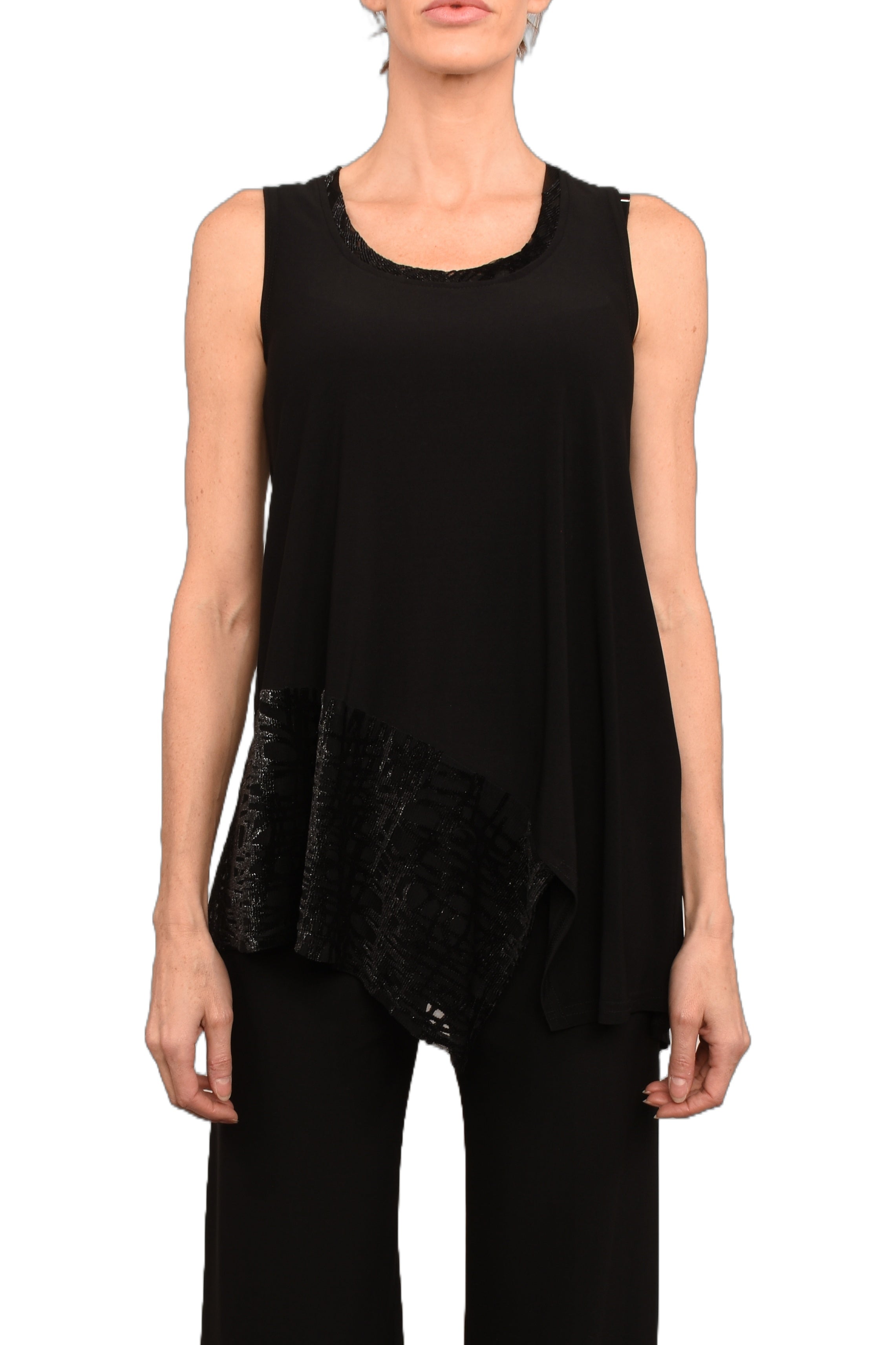 CP757 Noir- Cami en jersey avec insertion de lurex. 95% polyester 5% spandex. Laver au délicat à l'eau froide seulement. Sécher à plat ou suspendre. Fait au Canada.