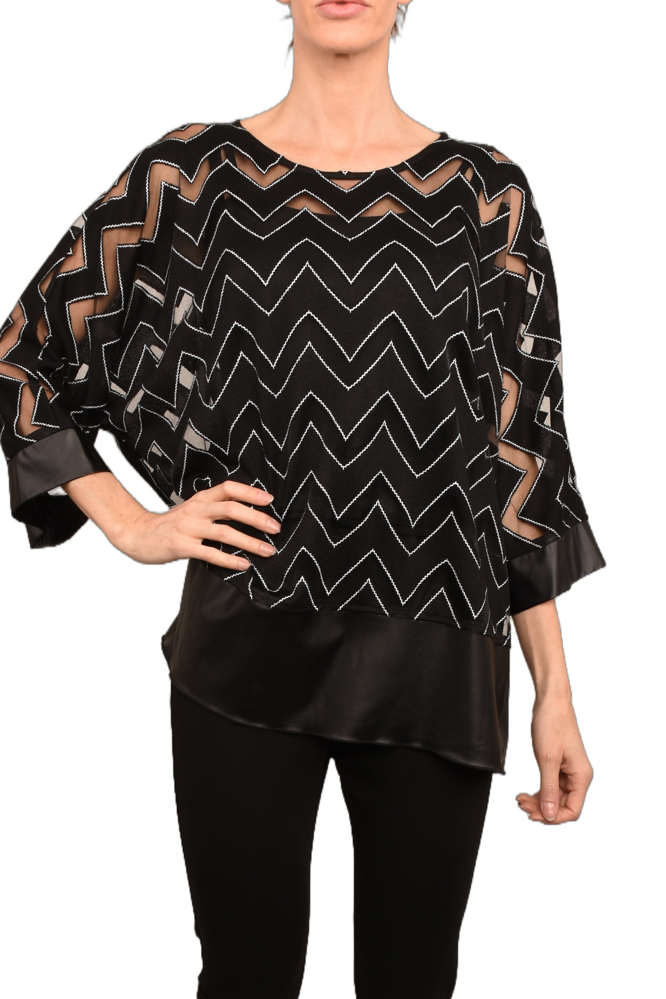 TN887- Haut à coupe évasé transparent avec col ras du cou et manches 3/4. Insertion de cuirette. Fait au Canada.